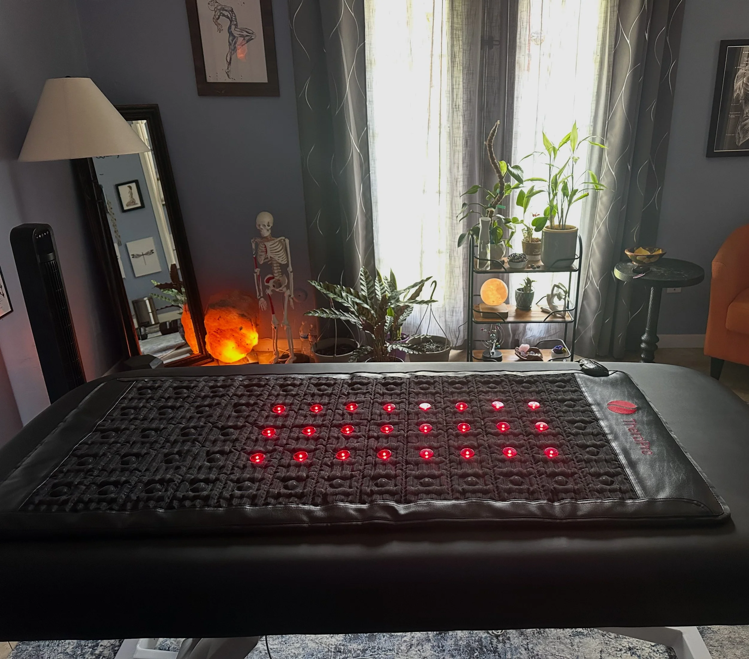 Every session includes time on my Therasage Biomat, which combines PEMF therapy, infrared heat, red light therapy, and gemstone technology to enhance your relaxation at the cellular level. This therapeutic mat boosts circulation, reduces pain, promotes restorative sleep, stimulates tissue repair, relieves muscle tension, and supports detoxification and overall wellness.