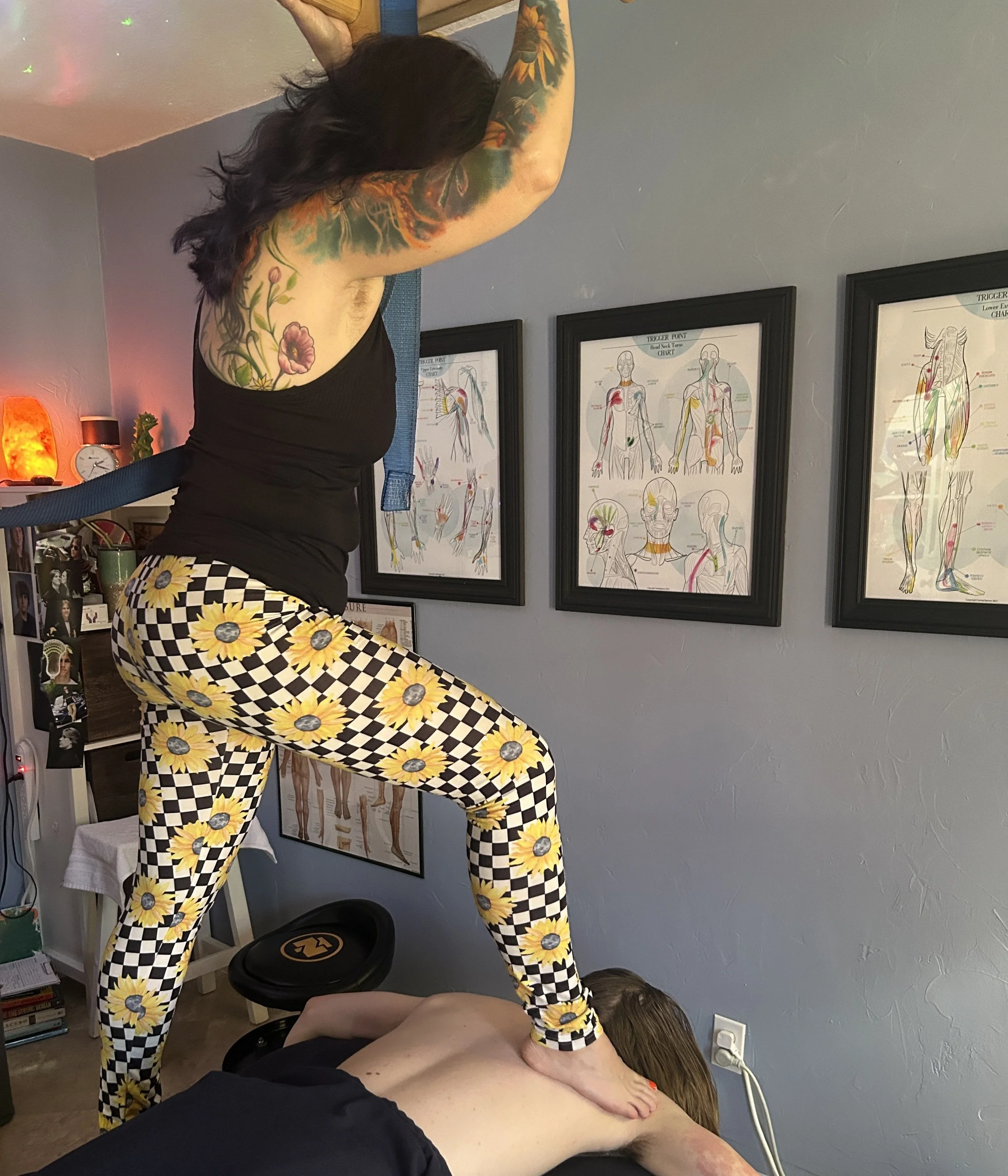 I use my feet to deliver sustained, deep pressure that reaches levels of soft tissue in ways that hands simply can't. This slow, deliberate work releases tension while calming your nervous system, making it especially effective for large muscle groups like your back, hamstrings, glutes, and shoulders. The technique combines elements of Ashiatsu and myofascial-focused barefoot methods.